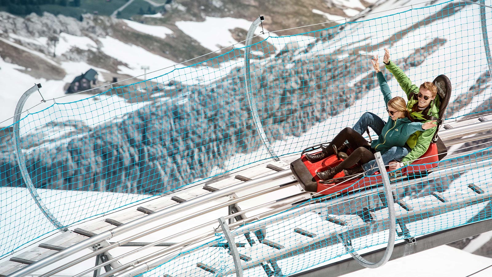 Die höchstgelegene Schienen-Rodelbahn der Welt bietet rasanten Sommer-Spass hoch über den Gletschern. Der Alpine Coaster GLACIER 3000 startet bei rund 3 000 m ü. M., führt über ungefähr einen Kilometer, 10 Kurven, einen spektakulären 520-Grad-Kreisel, 6 Wellen und 3 Jumps und ermöglicht Geschwindigkeiten von bis zu 40 km/h, die ihr über einen Bremshebel selbst steuern könnt.
