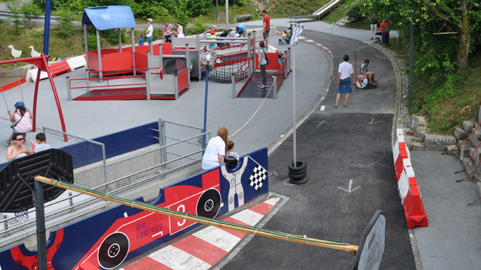 La place de jeu Rodtegg est ouverte à tous, au sens propre comme au figuré. Il s’agit d’une place de jeu accessible aux fauteuils roulants, qui amuse aussi les enfants sans handicap. Carrousel, jeu d’eau et petites devinettes permettent de divertir toute la famille. Les parents peuvent s’amuser avec leurs enfants ou échanger avec d’autres adultes en marge de la place de jeu.