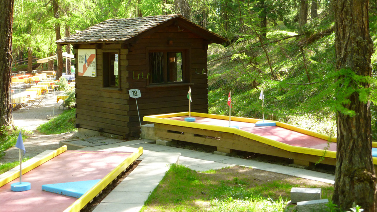 Il campo da minigolf si trova sopra l’Hotel Waldhaus Sils, in una rada foresta di larici, ed è caratterizzato da un’atmosfera tranquilla e naturale. È facilmente accessibile dal giardino dell’hotel e si trova vicino a un parco giochi per bambini e alla terrazza del giardino. La zona verde e appartata offre le condizioni ideali per trascorrere momenti rilassanti in famiglia, lontano dal trambusto del paese.