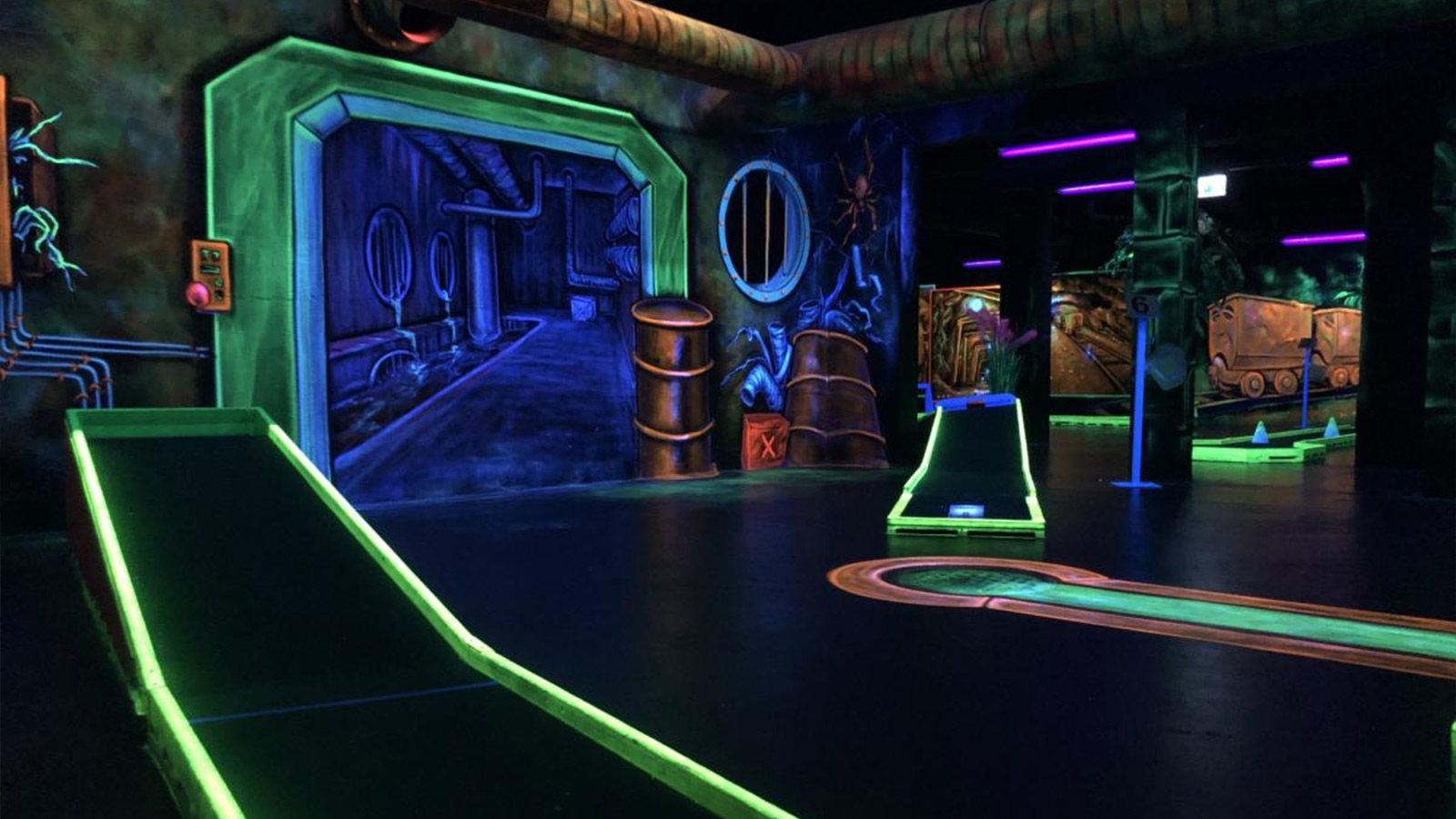Il percorso: il tracciato comprende 18 buche diverse in cui il minigolf può essere vissuto ben oltre il percorso classico e trasformarsi in un’esperienza ludica in mondi fantastici. I disegni creativi a luce ultravioletta e in 3D offrono intrattenimento e rendono il percorso particolarmente interessante per le famiglie, i bambini e i giovani. Poiché il gioco si svolge al chiuso, la struttura può essere utilizzata tutto l’anno, indipendentemente dal tempo.